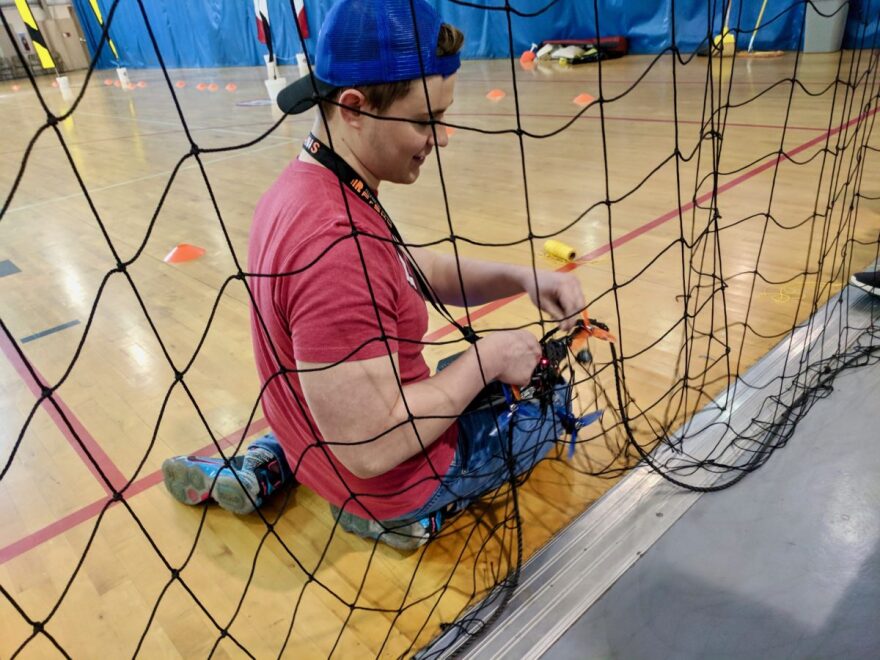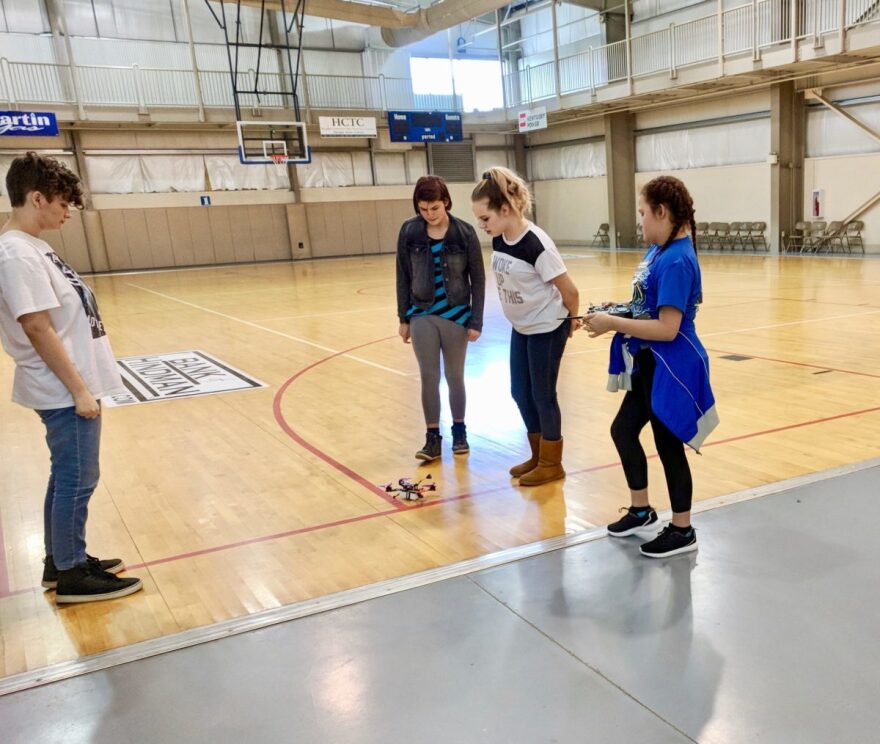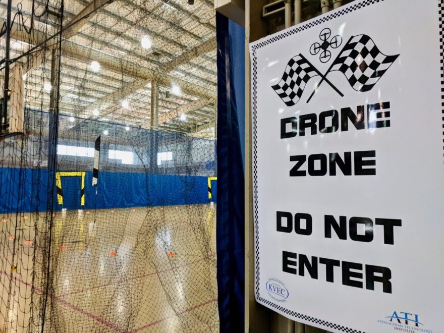 Student teams from across the coalfields of eastern Kentucky came together at the Knott County Sportsplex, bringing with them drones that they themselves had built. It was time for the climax of this year-long project. A basketball court had been separated with nets, and padded gates marked a circuit course for the little flying machines.