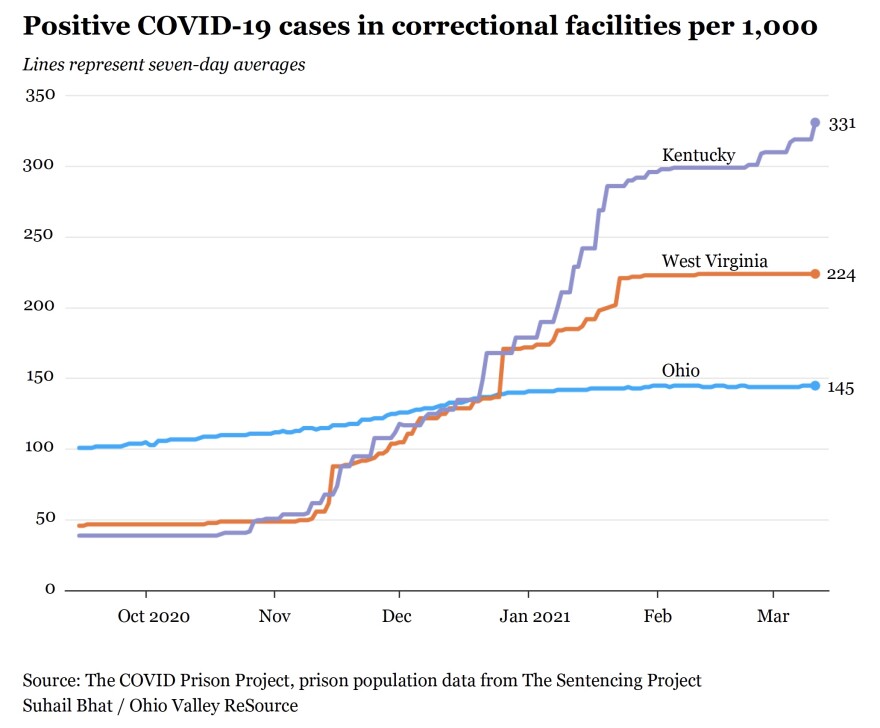 Since the pandemic started, more than 15,000 people in prisons and jails around the Ohio Valley have tested positive for COVID-19, according to data from the COVID Prison Project, a database tracking COVID-19 in jails and prisons.